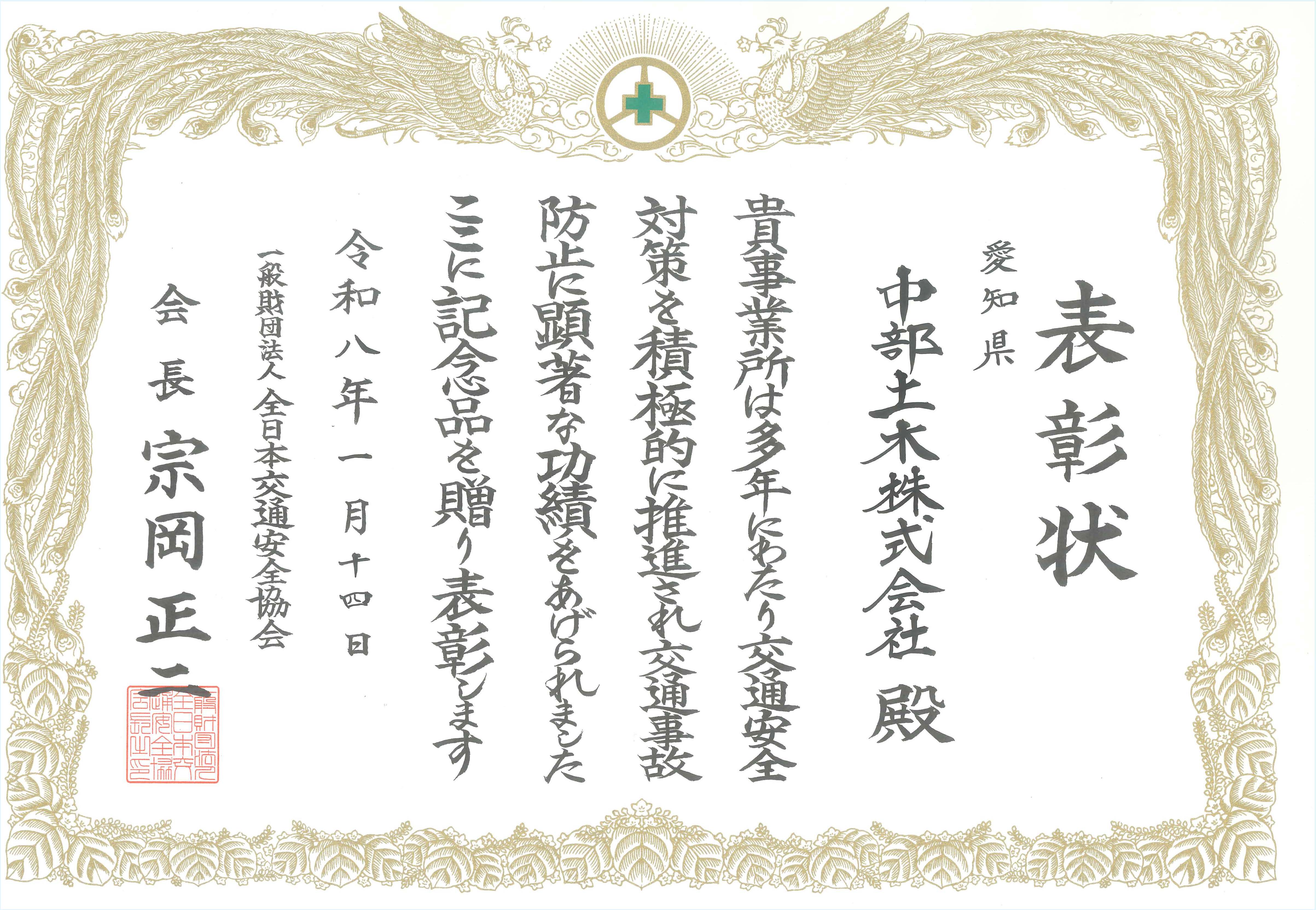 1月14日(水)、全日本交通安全協会より表彰状を頂きました。多年にわたり交通安全対策を積極的に推進され交通事故防止に顕著な功績をあげたことを評価され、表彰に至りました。