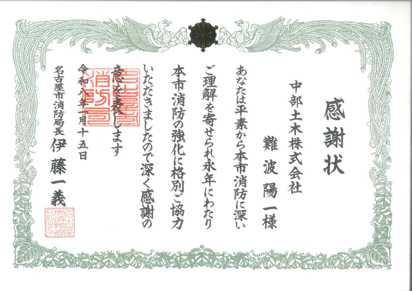 名古屋市消防局より感謝状を頂きました。 | ニュース | 中部土木株式会社 - 土木・舗装施工を主体とした建設会社