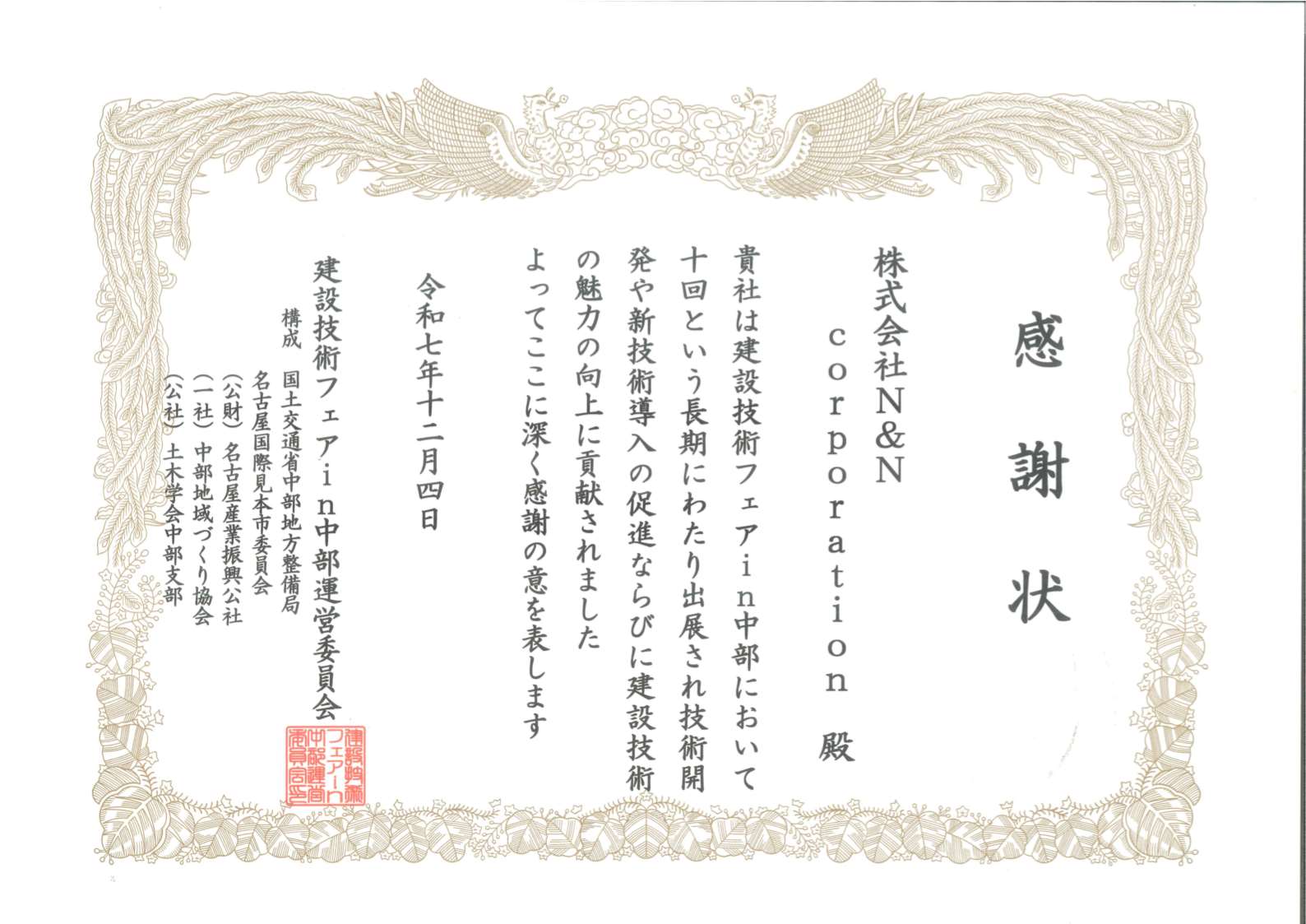 建設技術フェアより感謝状を頂きました。 | ニュース | 中部土木株式会社 - 土木・舗装施工を主体とした建設会社