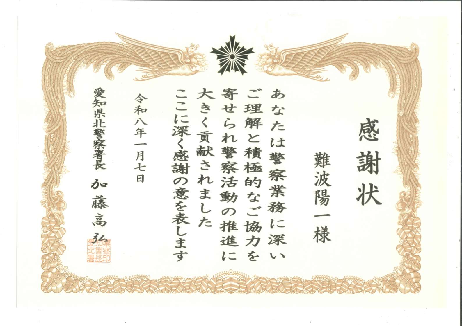 1月7日(水)、愛知県北警察署長より感謝状を頂きました。警察業務に深いご理解と積極的なご協力を寄せられ警察活動の推進に大きく貢献したことを評価され、表彰に至りました。