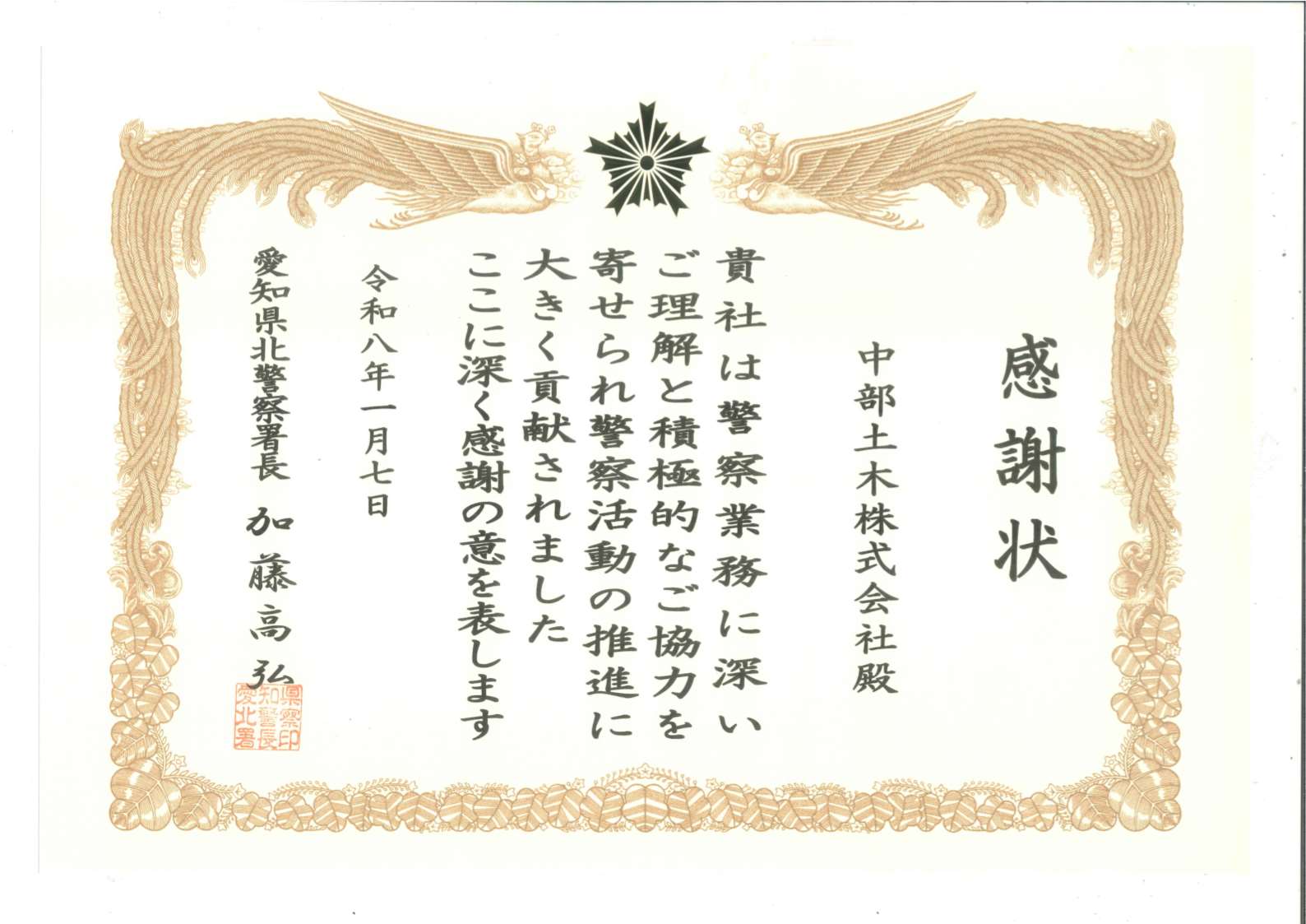 愛知県北警察署より感謝状を頂きました。 | ニュース | 中部土木株式会社 - 土木・舗装施工を主体とした建設会社