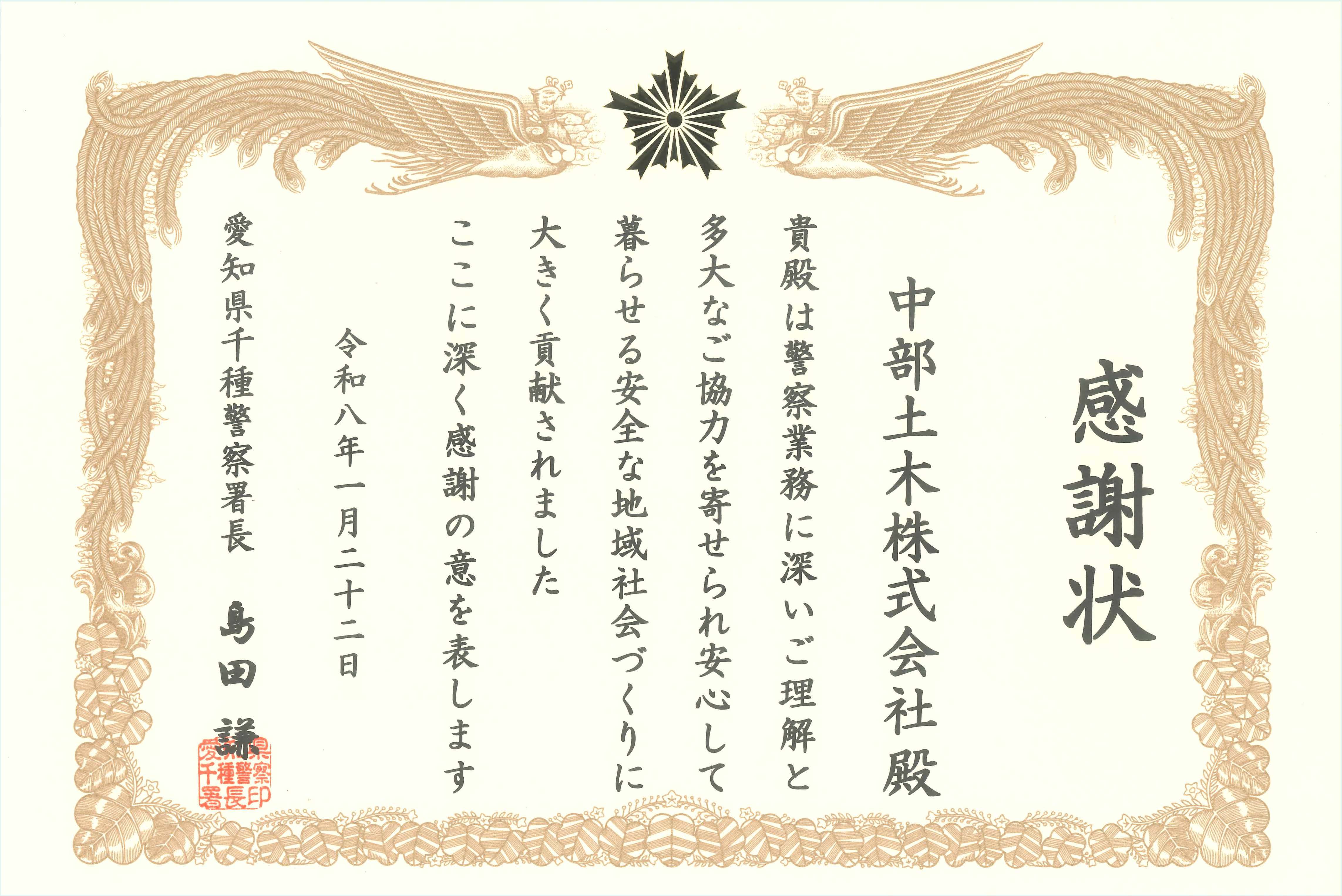 愛知県千種警察署より感謝状を頂きました。 | ニュース | 中部土木株式会社 - 土木・舗装施工を主体とした建設会社
