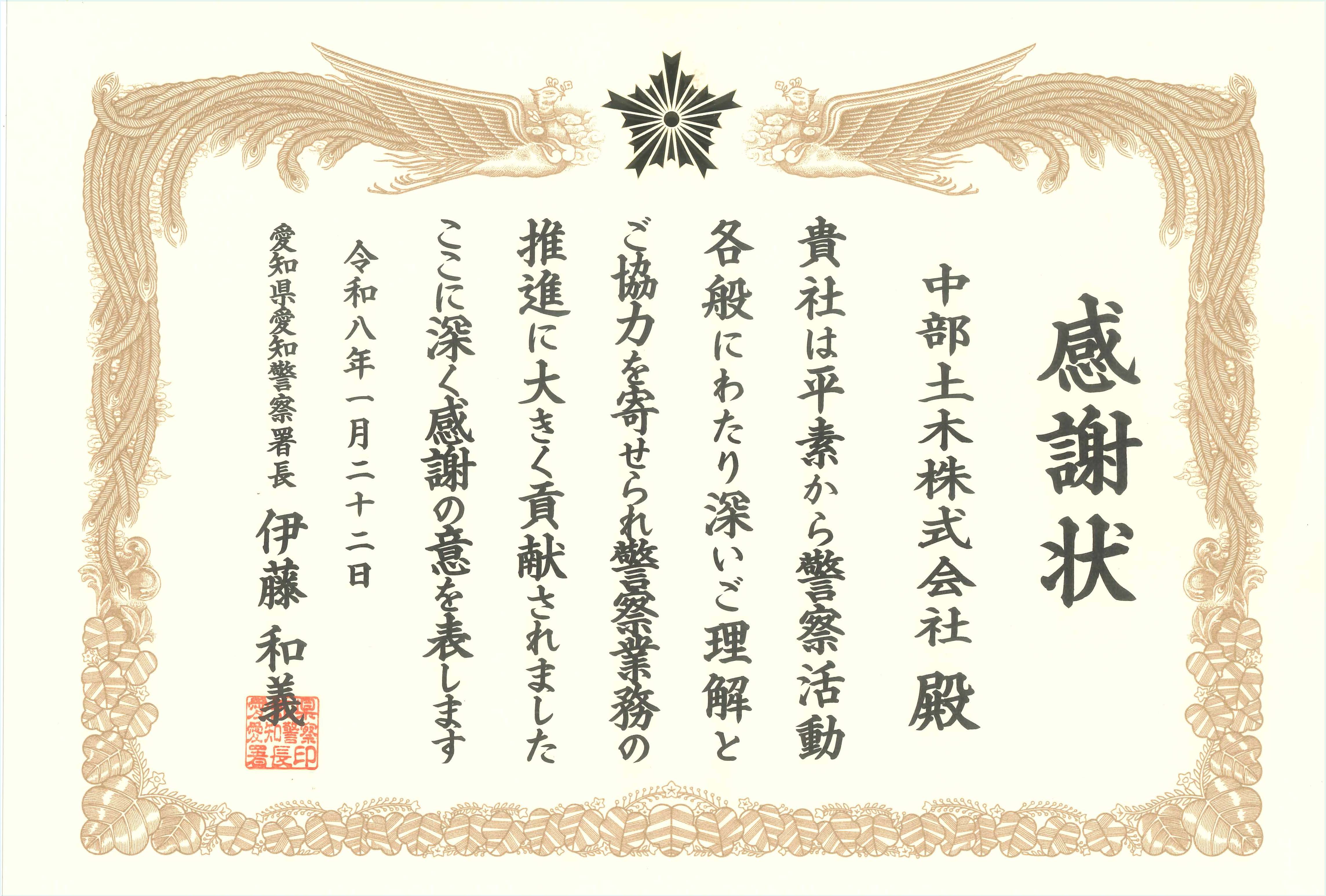 1月22日(木)、愛知県愛知警察署より感謝状を頂きました。平素から警察活動各般にわたり深いご理解とご協力を寄せられ警察業務の推進に大きく貢献したことを評価され、表彰に至りました。