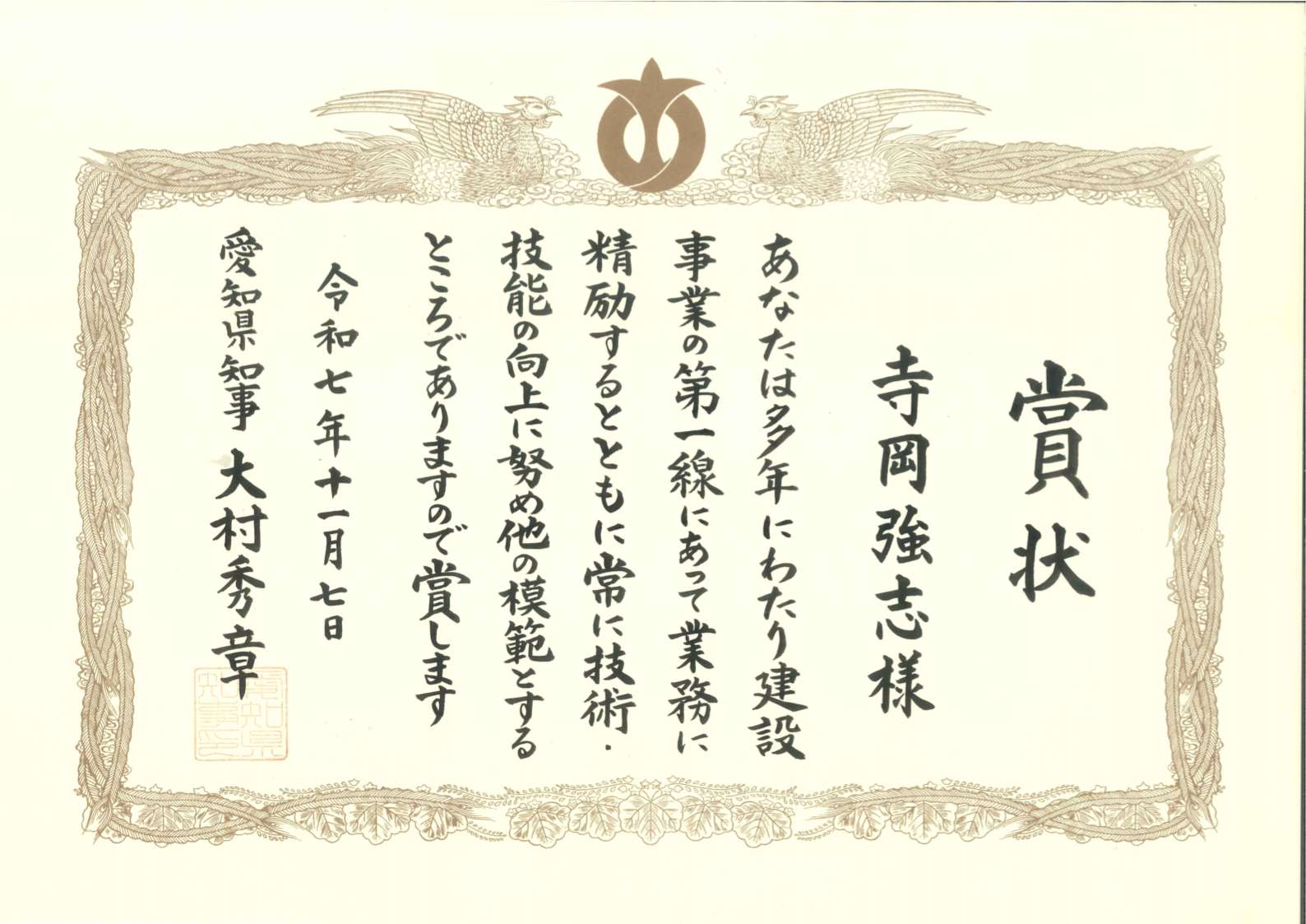 11月7日(金)、愛知県知事より表彰状を頂きました。多年にわたり建設事業の第一線にあって業務に精励するとともに常に技術・技能の向上に努め他の模範になることを評価され今回の表彰に至りました。